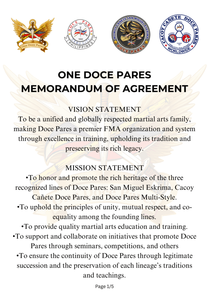 This ceremony marks an important milestone in the history of the system, as it seals the official unification and collaboration of the various styles under the common umbrella of „One Doce Pares.“ It is a strong statement of the desire to preserve traditions, promote exchange, and strengthen the community of martial artists worldwide. Through this agreement, the legacy of Doce Pares is further solidified and secured for future generations.